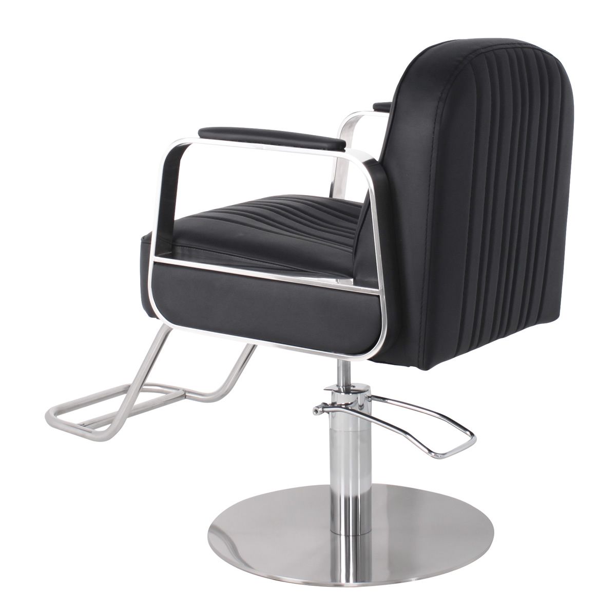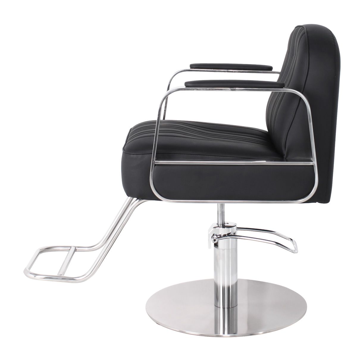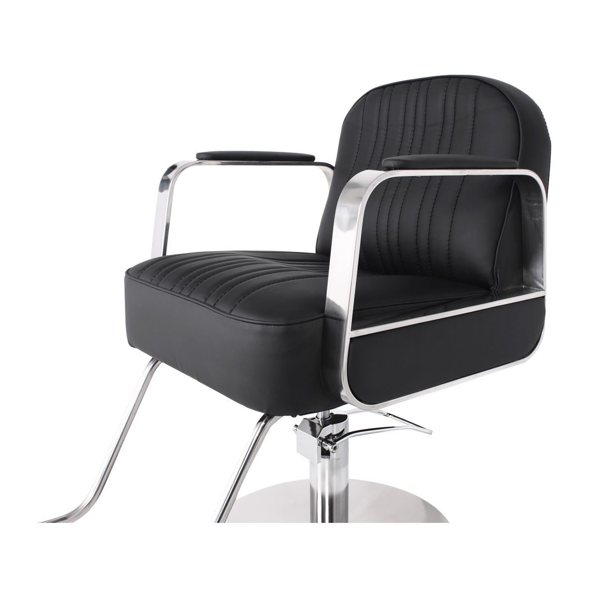 "OREGON" Hair Styling Chair (SKU: B-807) - 1-year warranty on the chair, 2-year warranty on the hydraulic base - Available in Premium Black with black stiches - Top grade smooth vinyl resembles touch of real leather - Molded high density memory foam for extra comfort and longer duration of use - Stainless arms in matte finish with soft padding - Features stainless steel disc base, with oversized U-shaped footrest - Foam and upholstery meet United States fire retardant standards - Some assembly required |